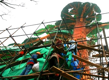 隨著2014年的日益臨近,2014自貢第二十屆恐龍燈會(huì)施工也是在緊張有序的進(jìn)行,走在彩燈公園里,處處都是一片忙碌的景象。冬日的彩燈公園,氣溫已降到5度,天空中飄著蒙蒙細(xì)雨,仍然呈現(xiàn)出一幅幅火熱的場(chǎng)面:機(jī)器轟鳴、焊花飛濺,彩燈師傅們堅(jiān)守在燈會(huì)彩燈制作的第一線,進(jìn)行緊張的作業(yè)中。有的打樣、有的在焊骨架、有的安裝電源、有點(diǎn)的在裱糊,在進(jìn)行高空作業(yè)時(shí),都按照相關(guān)安全規(guī)定,使用了安全帶。下面就是制作現(xiàn)場(chǎng)本屆燈會(huì)部分彩燈燈組的圖片: